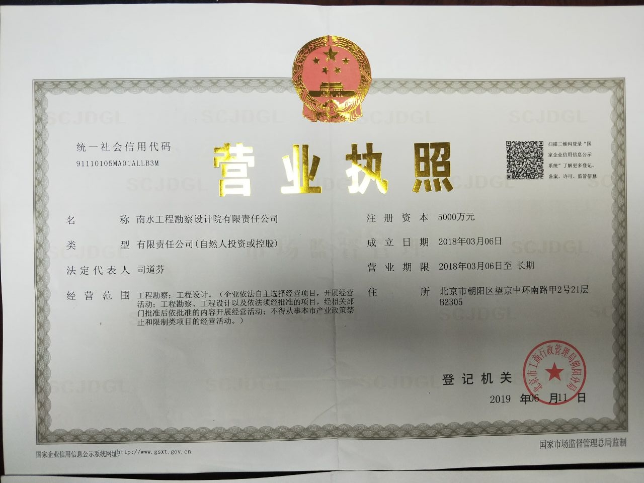 2018年初,总公司与北京四分公司负责人共同出资,经过半年时间的努力,终于在首都北京成立了南水工程勘察设计院有限责任公司,并于2019年初拿到了建筑设计资质证书,现该公司已正式挂牌运营。