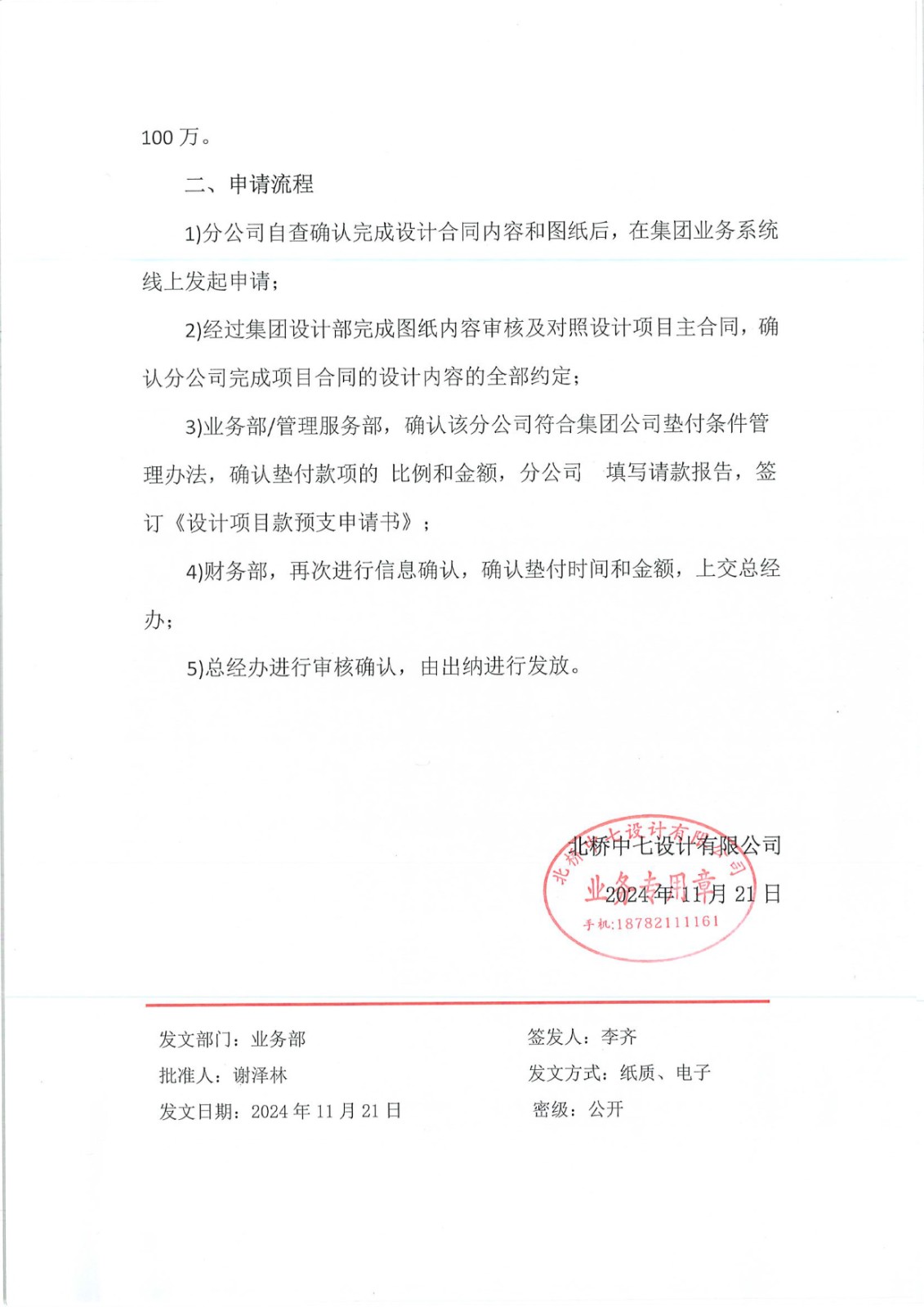 即日起,集团旗下各分公司承接到无法确定付款时间节点,周期的项目,满足一定的条件和要求后,在未收到甲方工程设计款的情况下,分公司可向集团总公司申请,预支该项目的一定比例的设计劳务款项,最高垫付40%劳务款,最高金额100万元,项目垫付款项的使用用途必须为支付分公司劳务人员用工薪酬中。